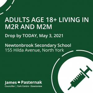 Adults who live in M2R or M2M can drop by today at North York General Hospital's mobile vaccine mobile clinic to book an appointment: